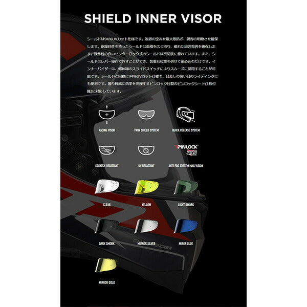 実用的で深く下がるインナーバイザー、視野角の広いシールド等はそのままにカーボンファイバーを帽体に